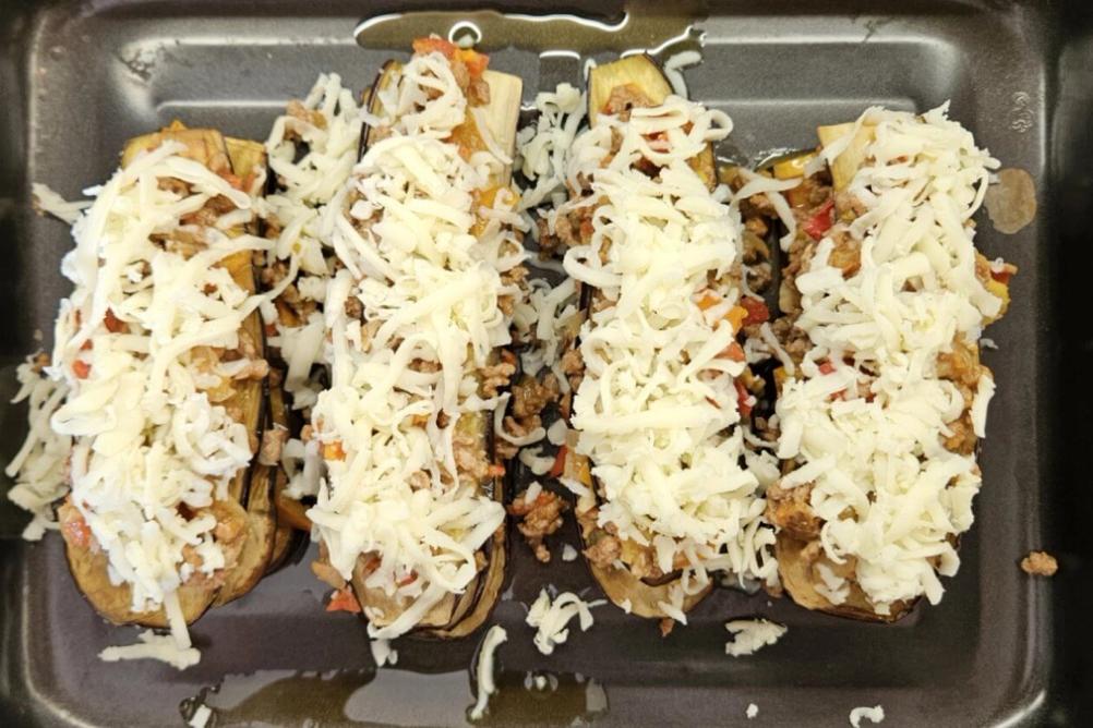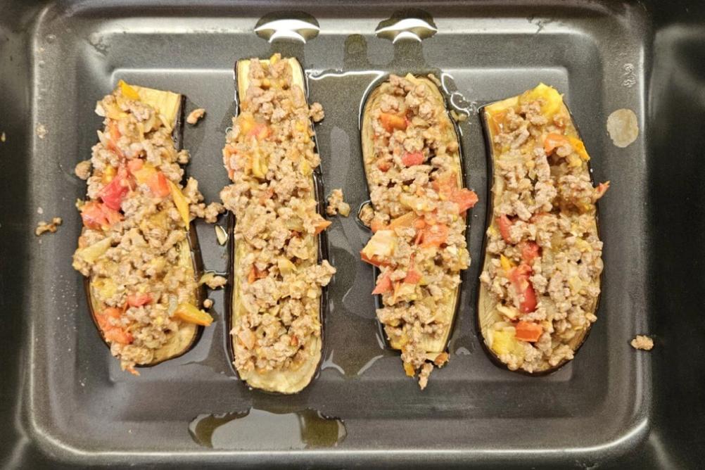 Tasty baked eggplants layered with flavorful meat stew – the perfect dish for a cozy dinner.