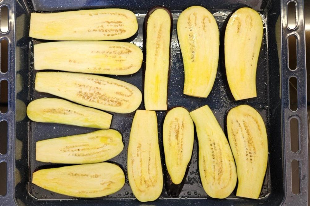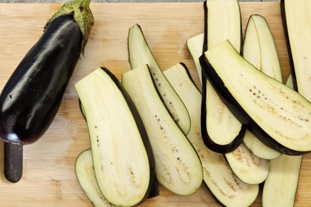 Wash the eggplants and cut them into long strips about one centimeter thick. Sprinkle with salt and let them rest for 10-15 minutes to draw out any bitterness. After that, rinse and pat them dry with a paper towel.