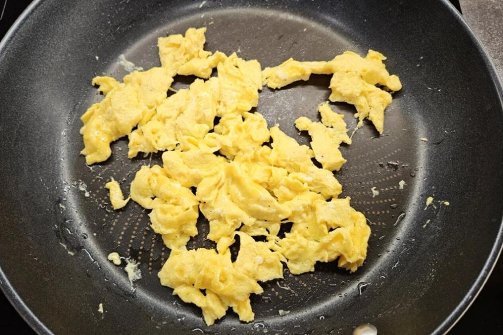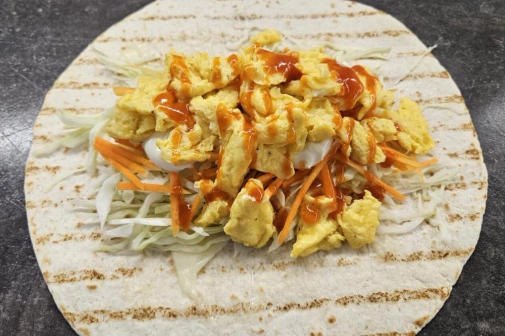 A quick and tasty snack or breakfast: a soft tortilla filled with eggs and your favorite toppings