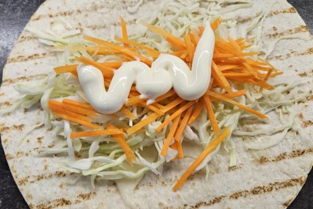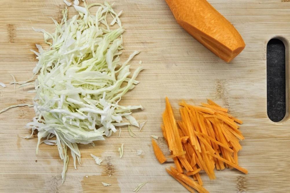 Shred the cabbage into thin strips and cut the carrot into strips.