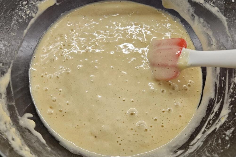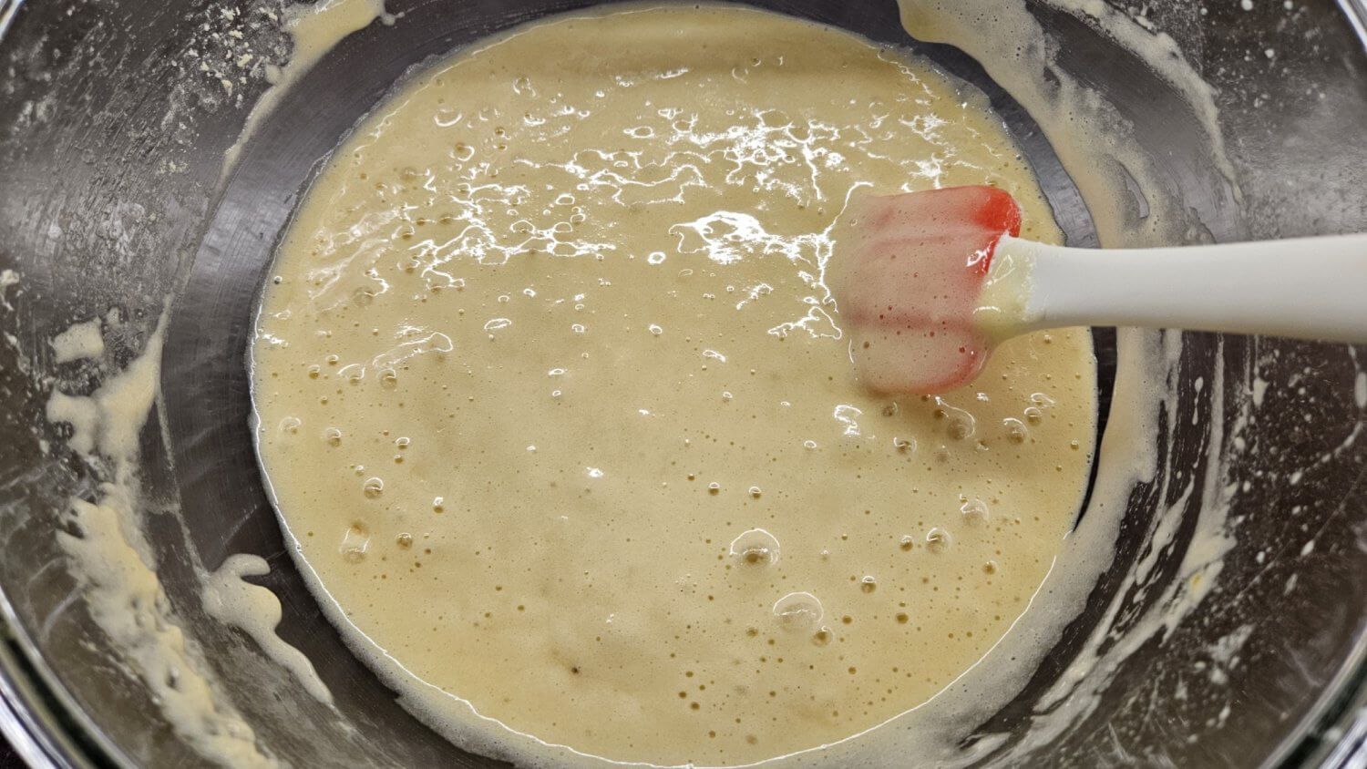 Gently add the flour and baking powder, then use a silicone spatula to mix until the flour is fully blended into the batter.