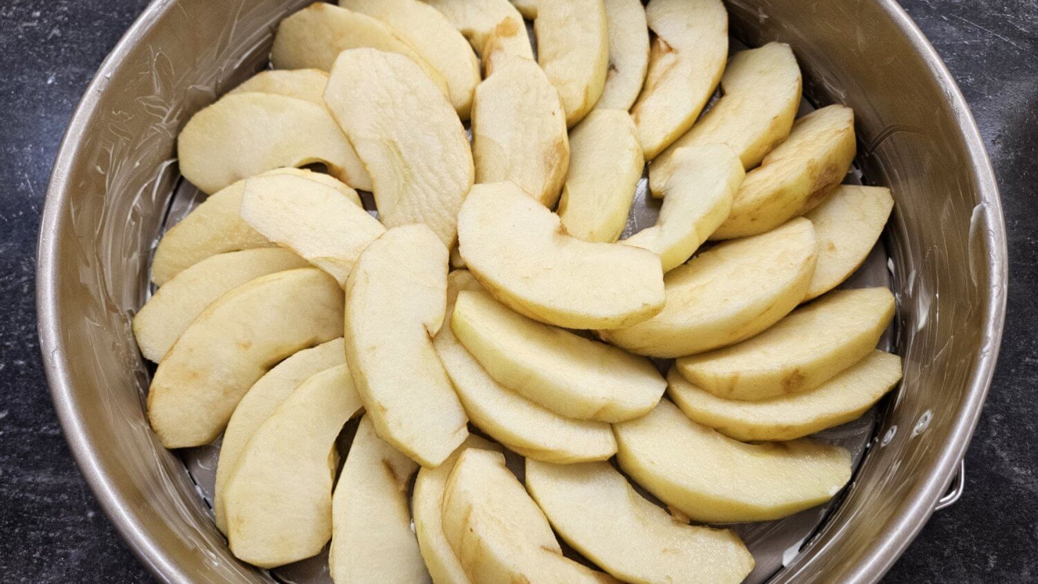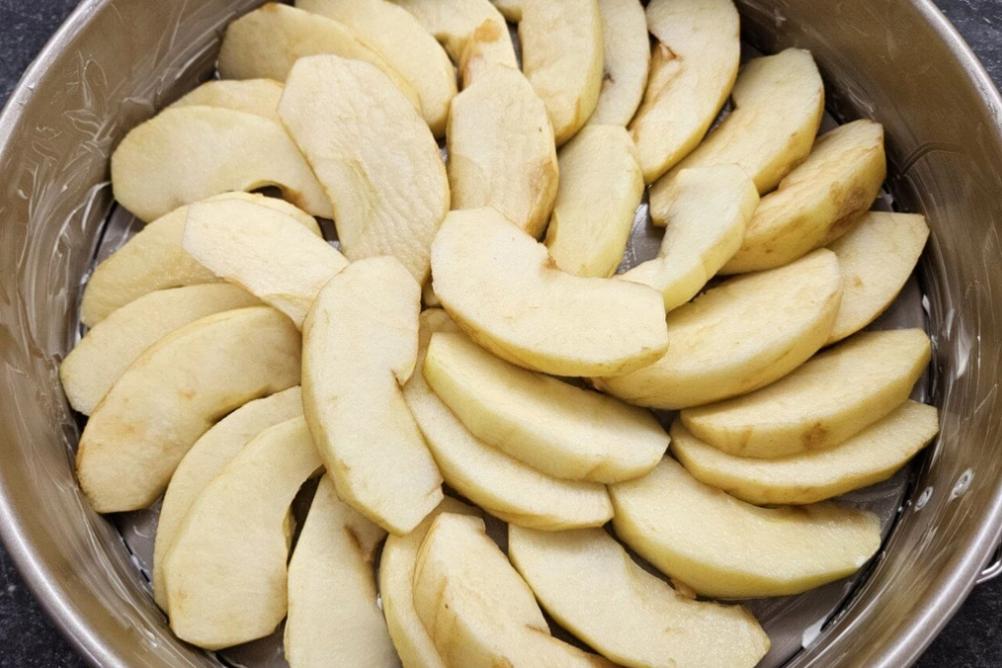 Arrange the prepared apple slices on the bottom of the baking dish.