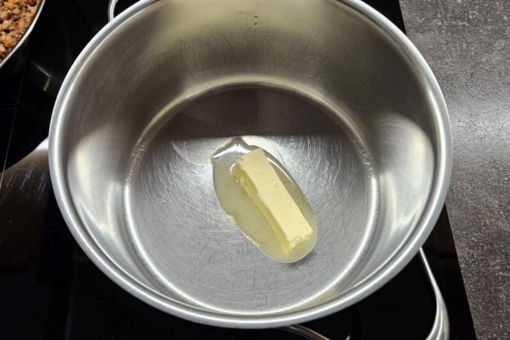 To make béchamel sauce, gently melt butter in a saucepan over low heat, taking care to avoid burning it.