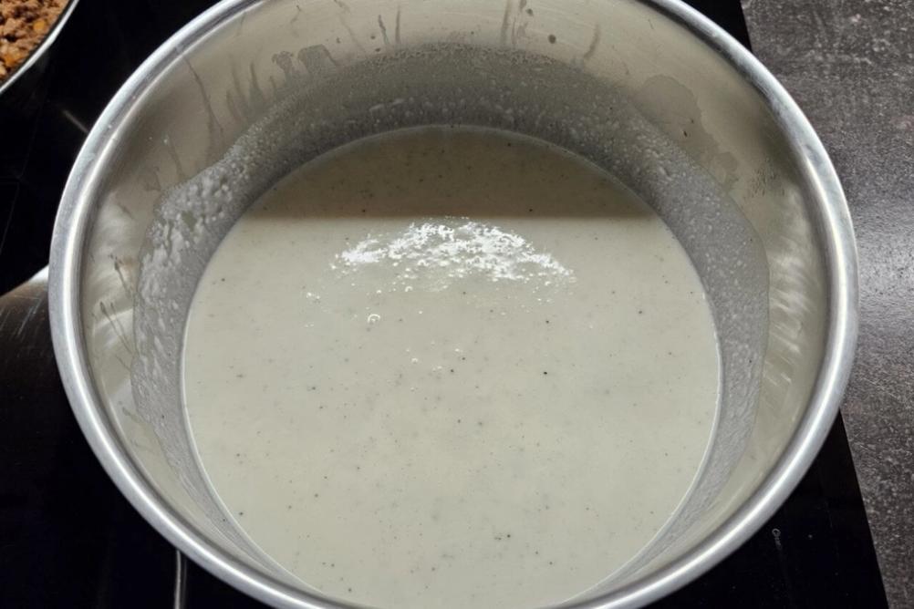 Important! To prevent lumps, pour in 3 tablespoons of milk at a time, stirring well each time. Repeat this process three times, then slowly add the remaining milk, mixing until the sauce is smooth.