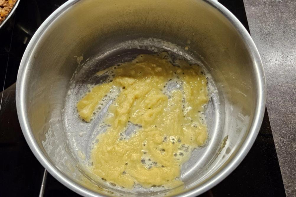 Add the plain flour to the melted butter and mix with a spoon or whisk. Let it cook for 1-1.5 minutes until the flour takes on a golden color.