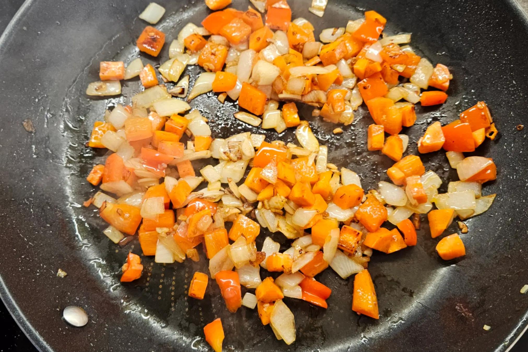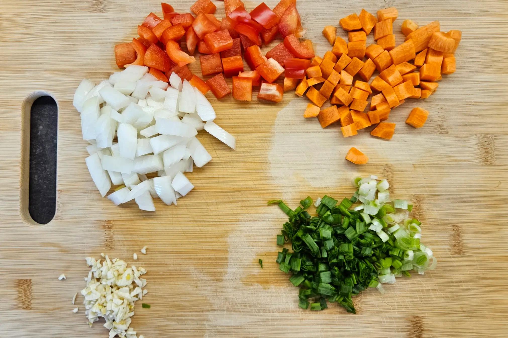Peel and dice the onion. Rinse and dice the red pepper. Peel and dice the carrot. Slice the scallions. Peel and mince the garlic