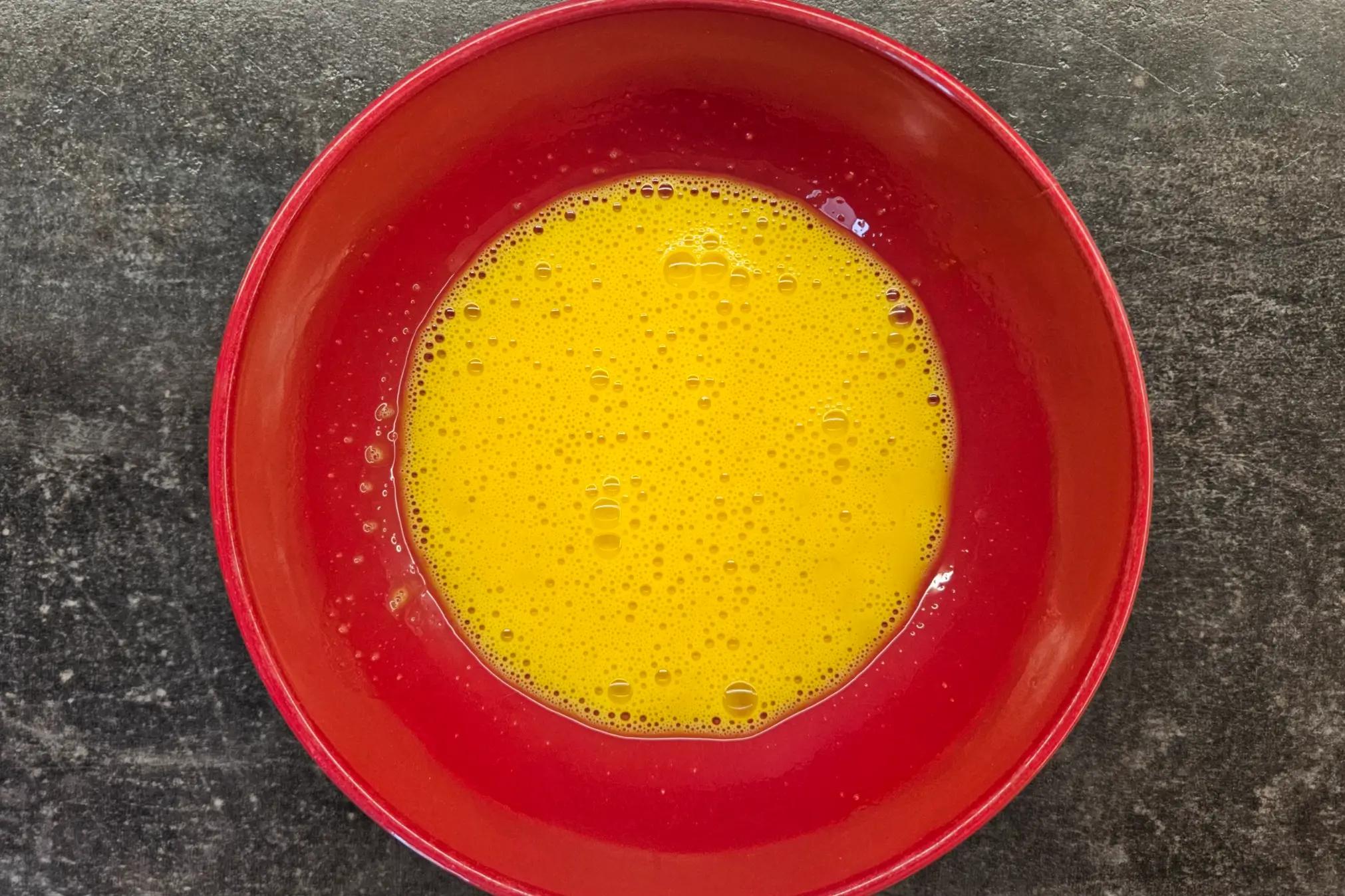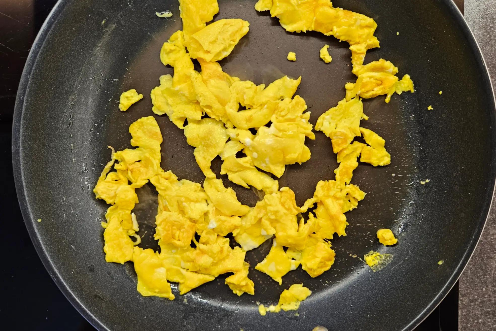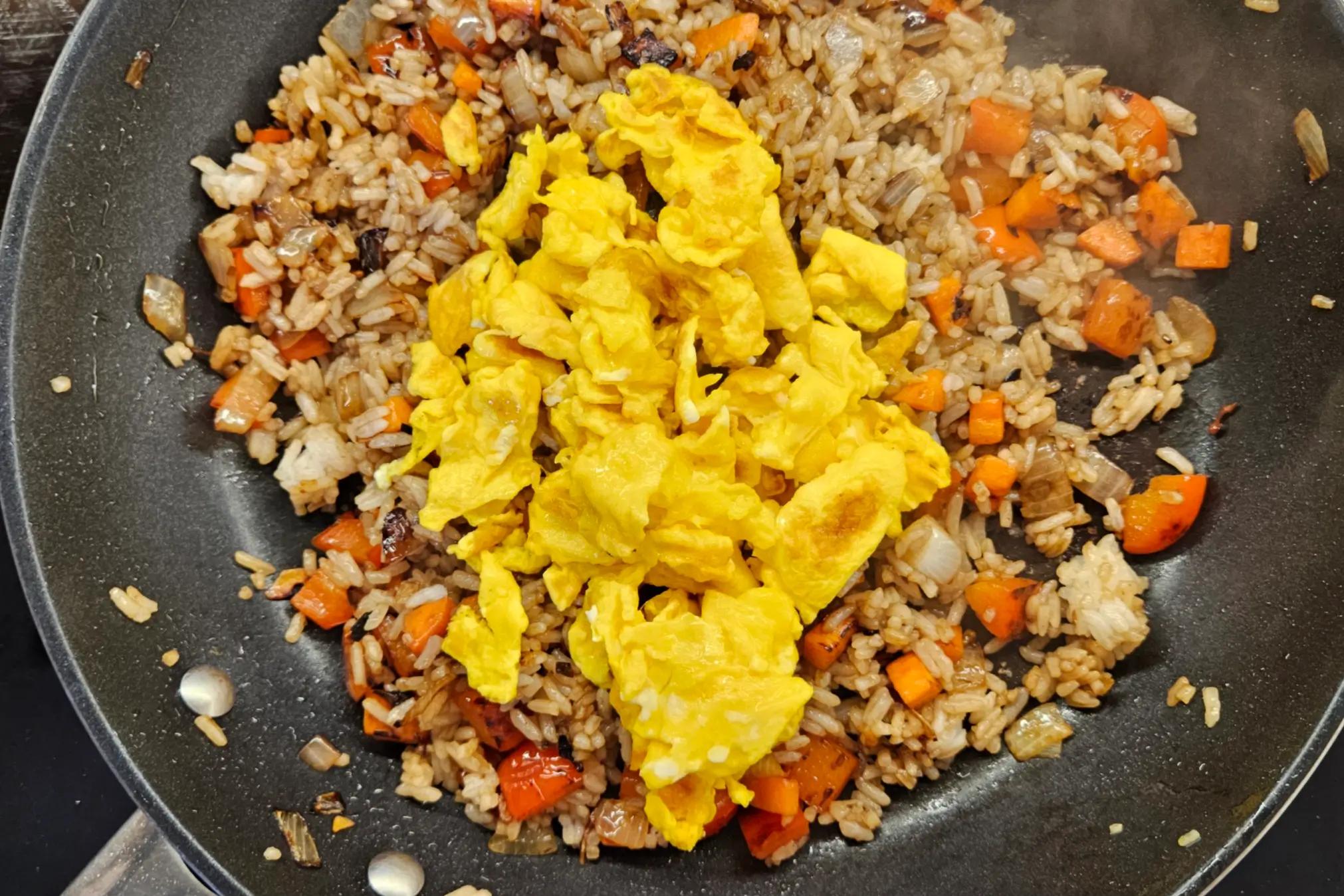 A wok is ideal for this recipe, but a regular skillet will do just fine. Heat the pan over high heat until it’s truly hot (on my stove that’s about 13 out of 15). Add 1 tbsp of oil. Pour in the eggs, let them set slightly (about 30 seconds), then break them into small pieces. Transfer the scrambled eggs to a separate plate.