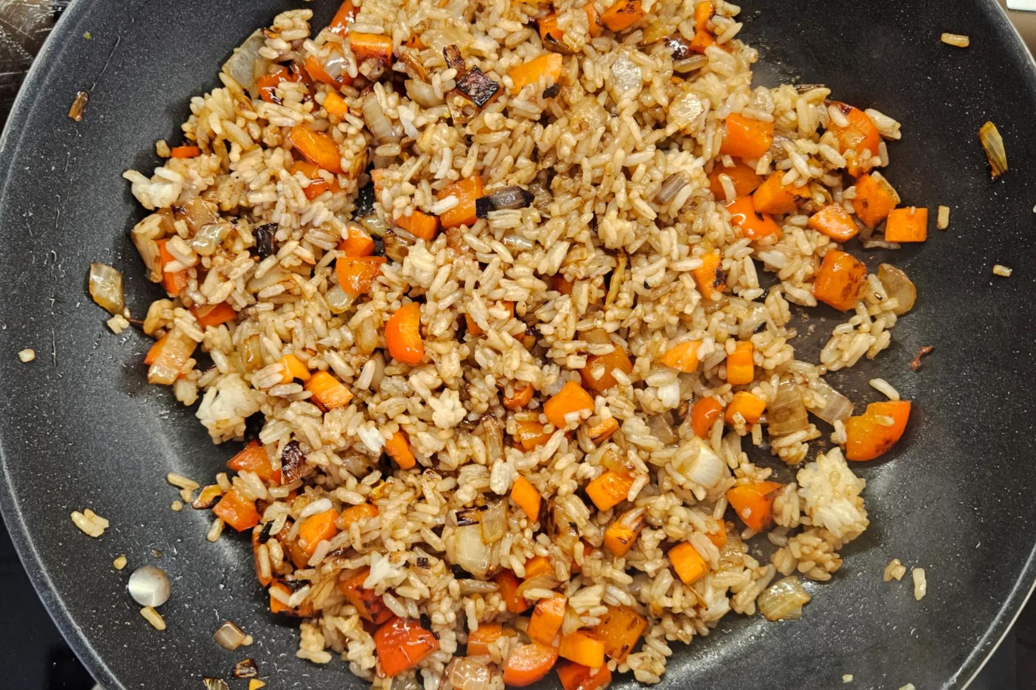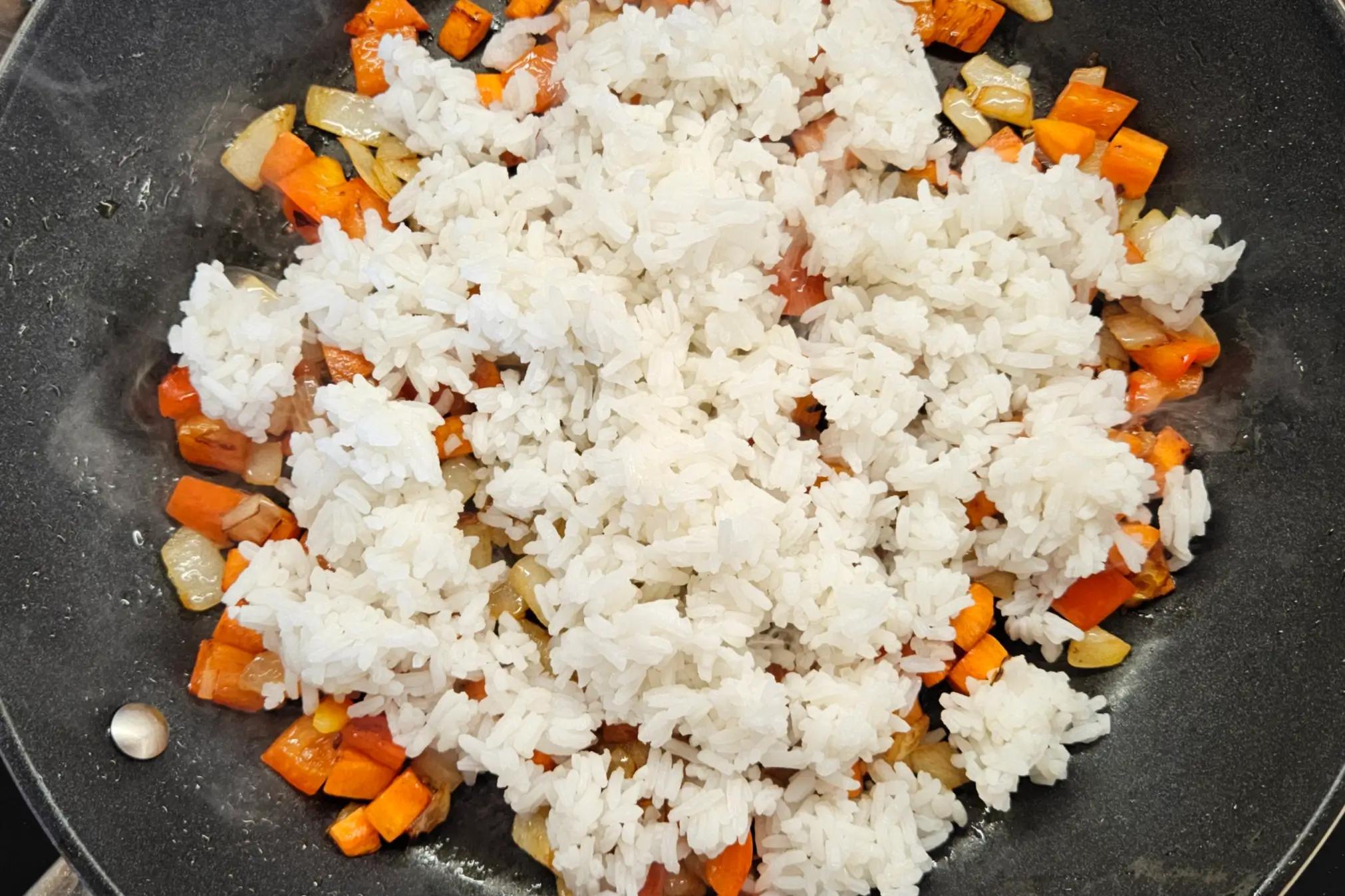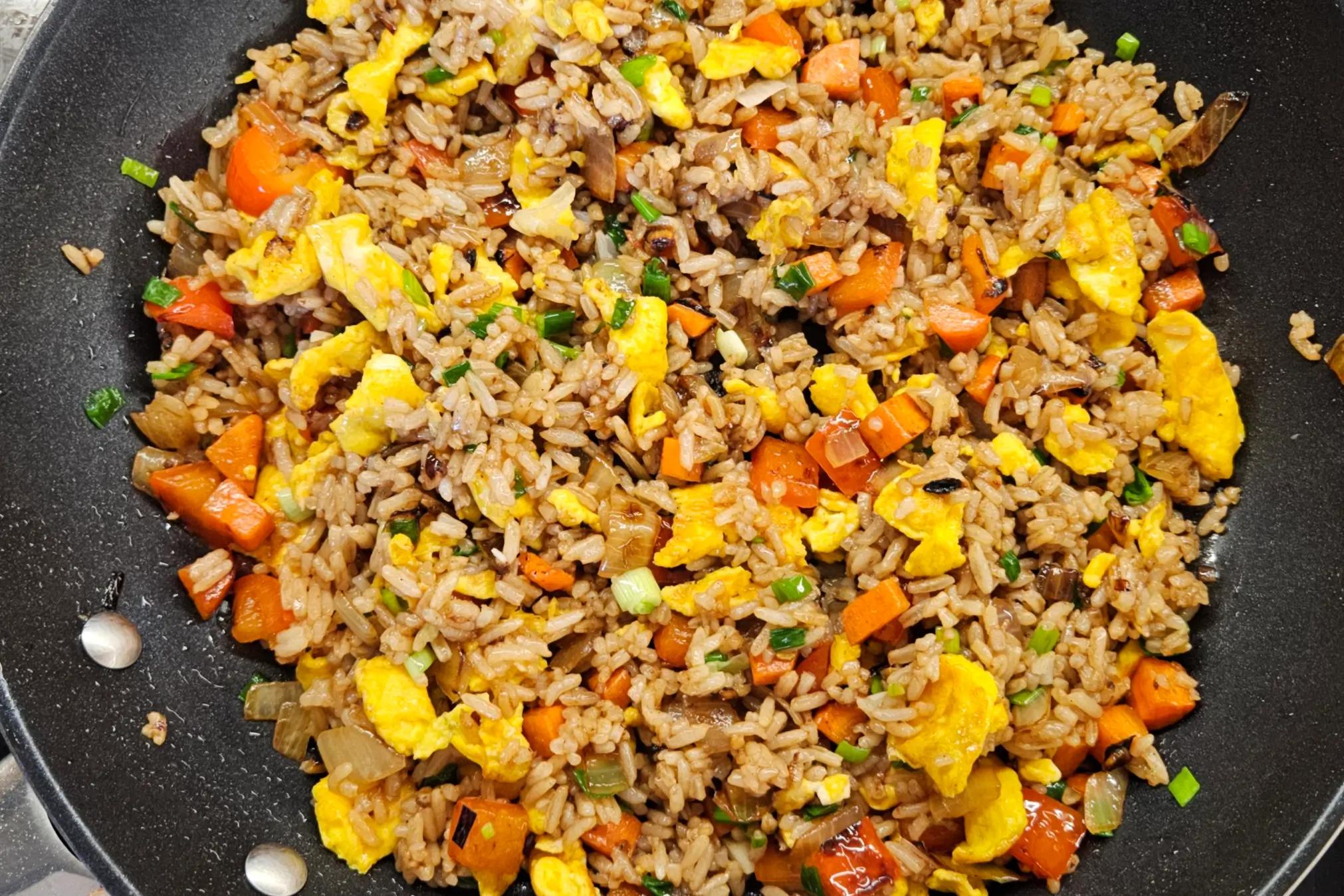 Asian-style stir-fried rice with aromatic jasmine, colorful vegetables, and soft scrambled eggs, all wok-tossed with soy sauce. Easy, balanced, and deeply savory — great when you want something quick with clean, bright flavor.