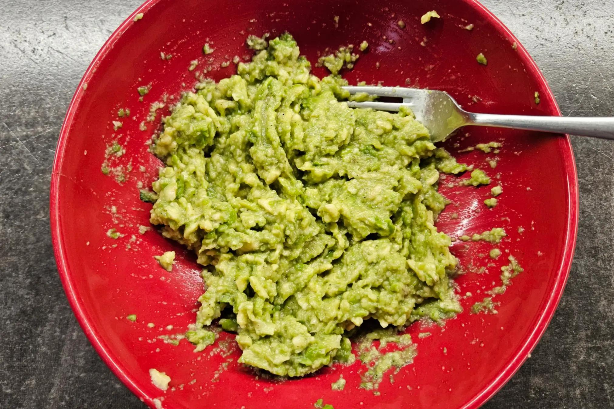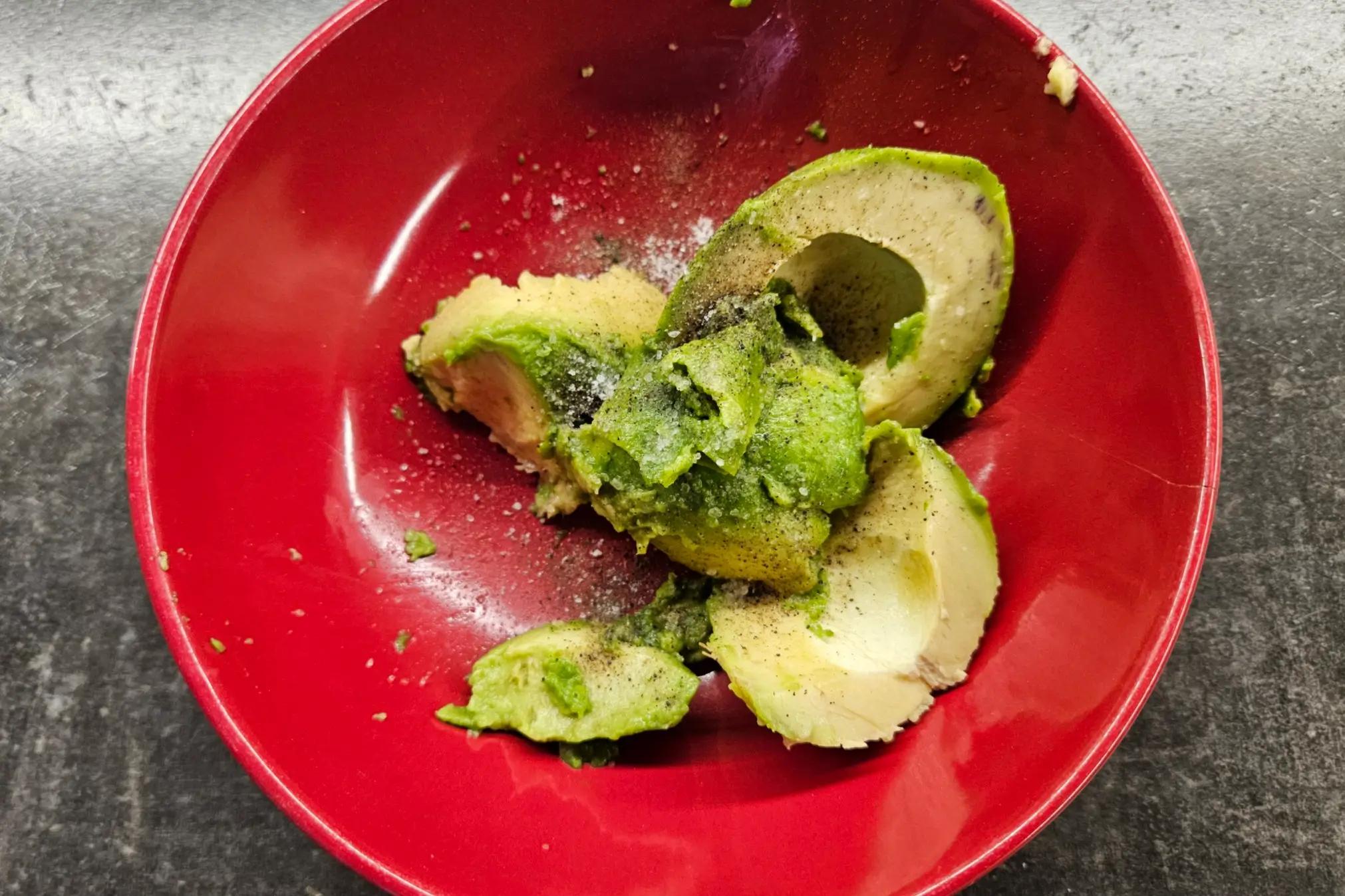 Cut a ripe avocado in half, remove the pit, and scoop the flesh into a bowl. Add a pinch of salt and black pepper.