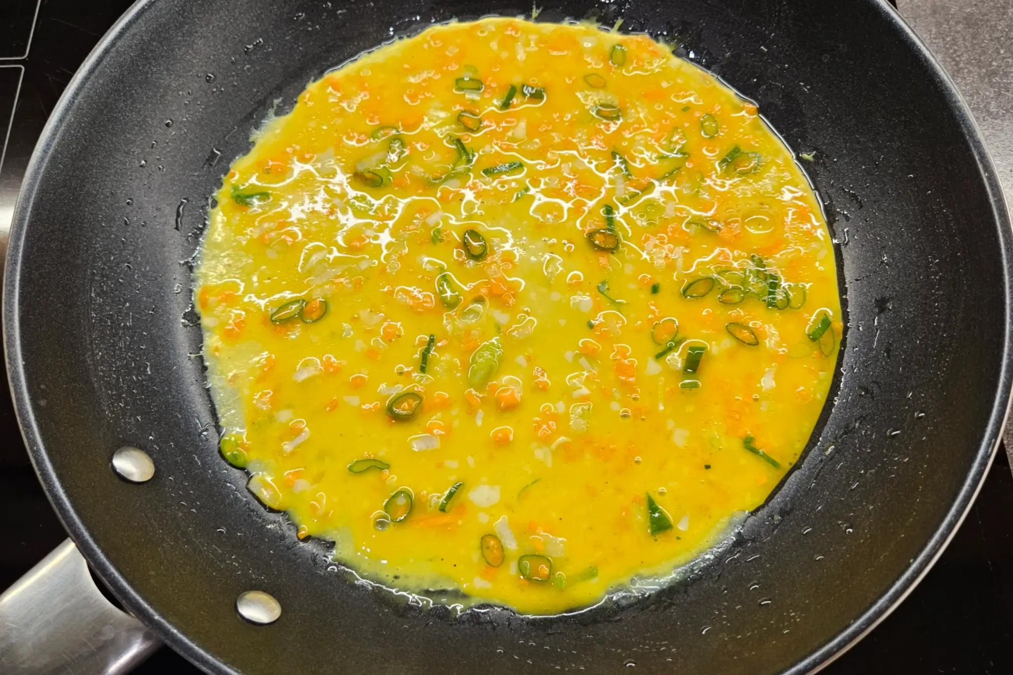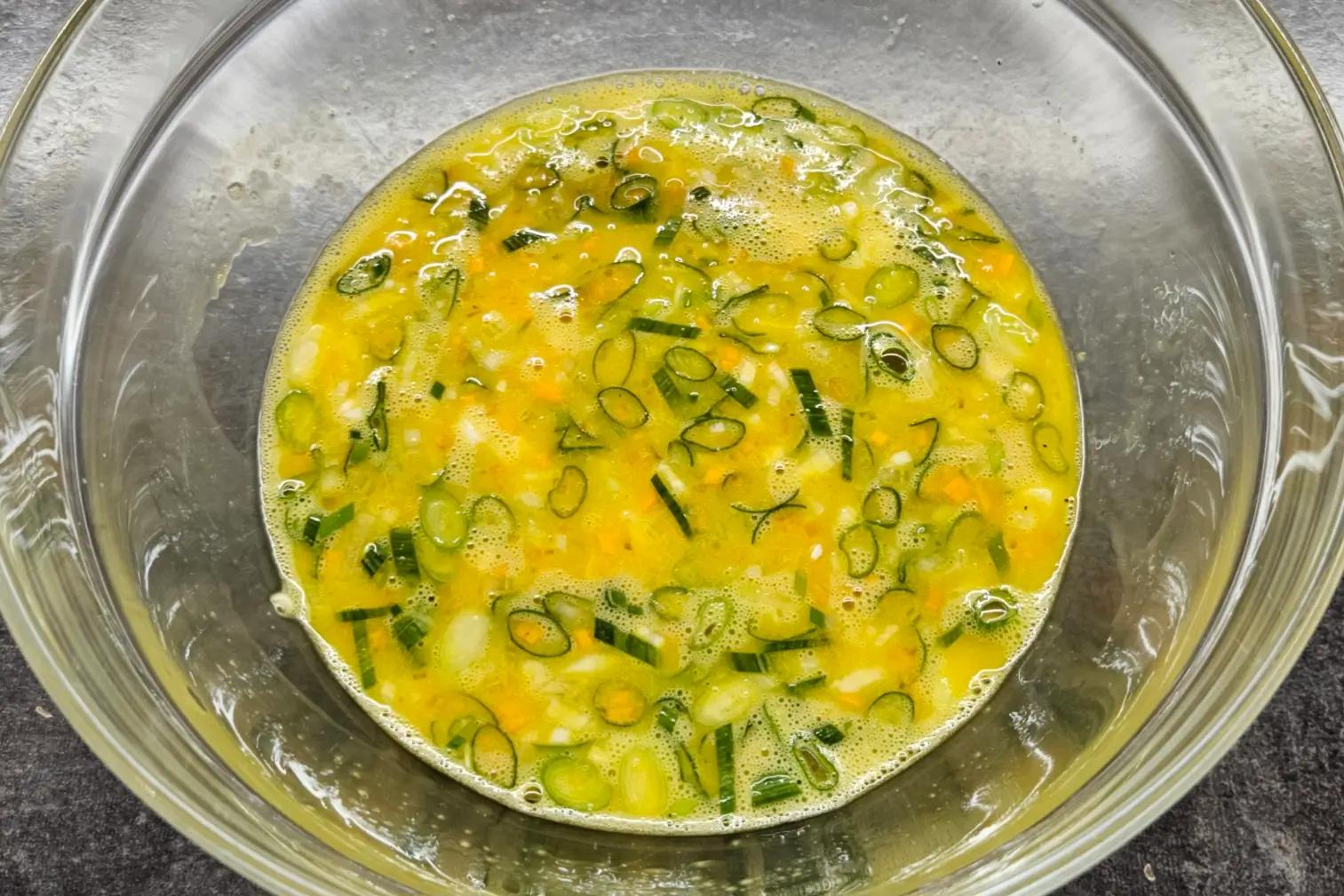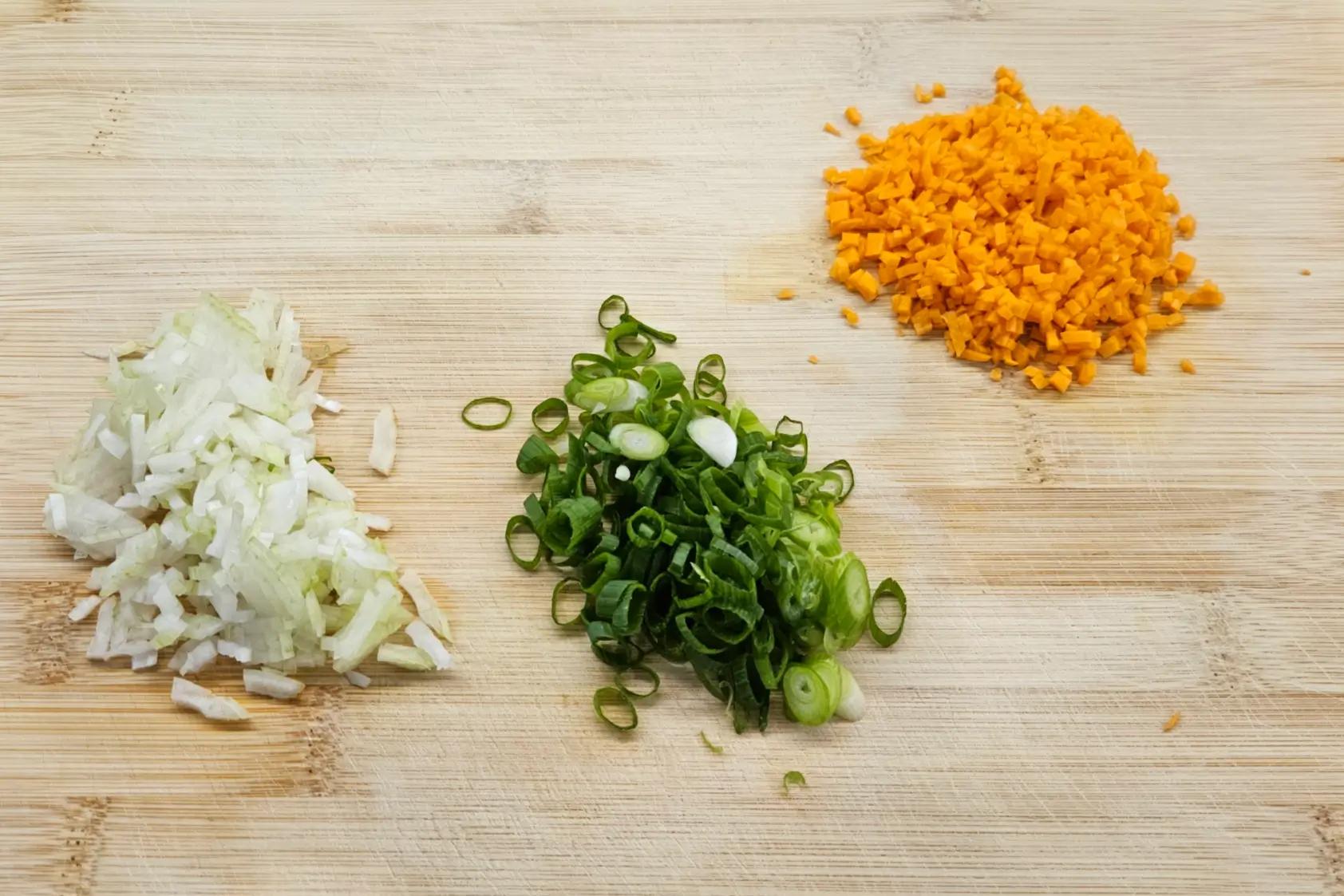 Finely chop the scallions, carrot, and onion. You should have about 50 g total. Chop as finely as possible so the veggies spread evenly and the roll forms easily.
