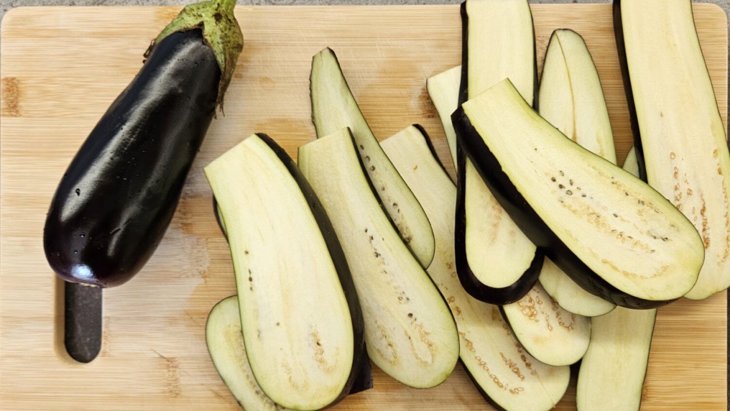 Wash the eggplants and cut them into long strips about one centimeter thick. Sprinkle with salt and let them rest for 10-15 minutes to draw out any bitterness. After that, rinse and pat them dry with a paper towel.