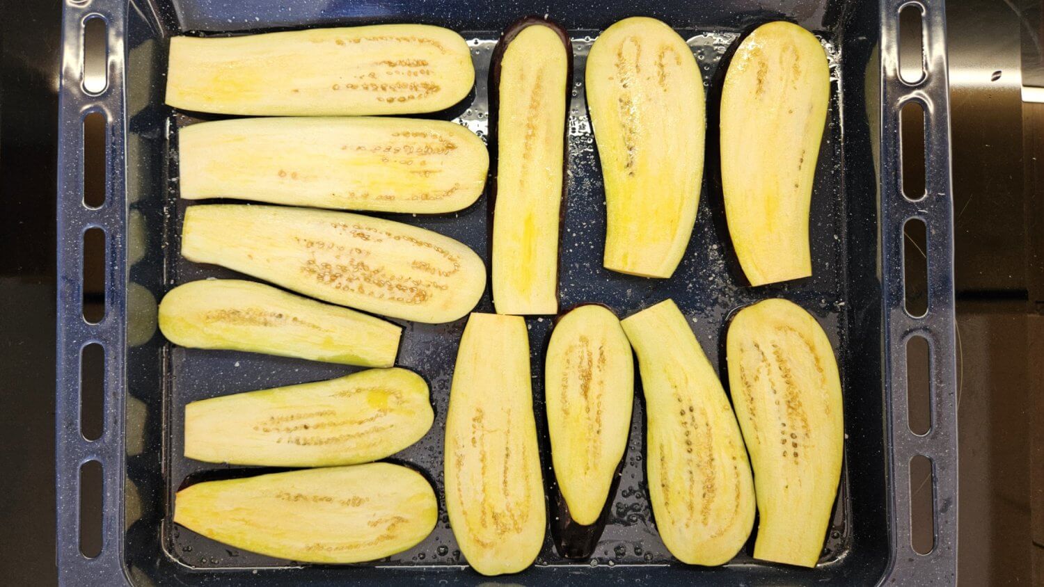 Place the eggplants on a baking sheet greased with oil. Season with salt to taste, drizzle with olive oil, and bake in the oven for 20 minutes at 180°C.