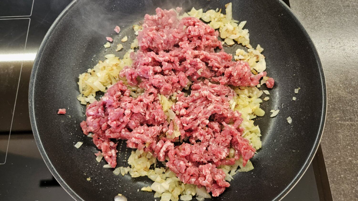 Add the minced meat, stir it in, and cook until it's evenly browned.
