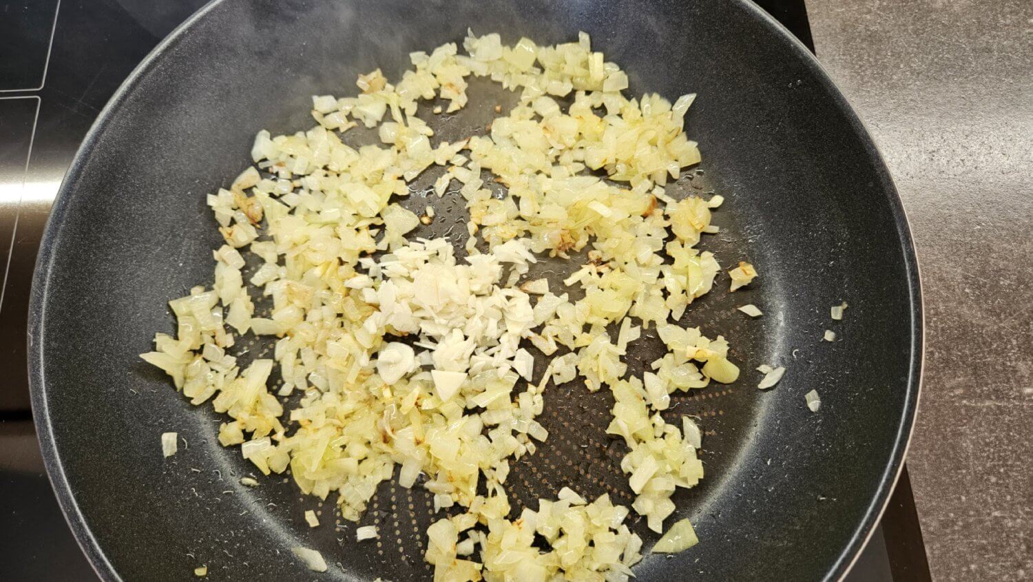 Heat olive oil in a pan over medium heat. Add the diced onion and sauté for about 3 minutes until softened. Then, add the minced garlic and cook for another couple of minutes.