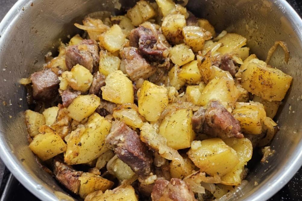 Transfer the cooked onions to the pot with the meat and mix well. Add the roasted potatoes and gently combine, being careful not to break the potato pieces.