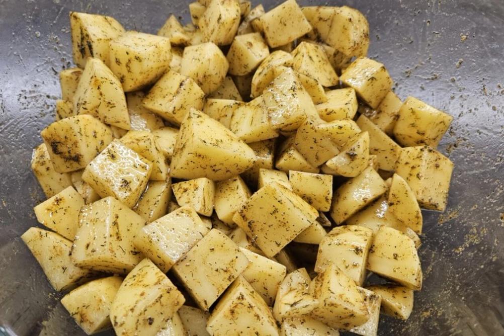 Peel the potatoes and cut them into 3 cm cubes. Season with spices, salt to taste, and sunflower oil. Mix well, spread evenly on a baking sheet, and roast in a preheated oven at 180°C for about 40 minutes, until golden and tender inside.