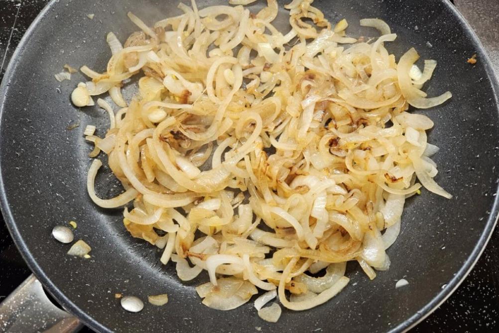 Peel and slice the onion into half-rings. In the same pan where the meat was cooked, add a little oil and cook the onions over low heat, stirring occasionally, until they soften and become slightly caramelized. Two minutes before they are done, add finely chopped garlic and stir.