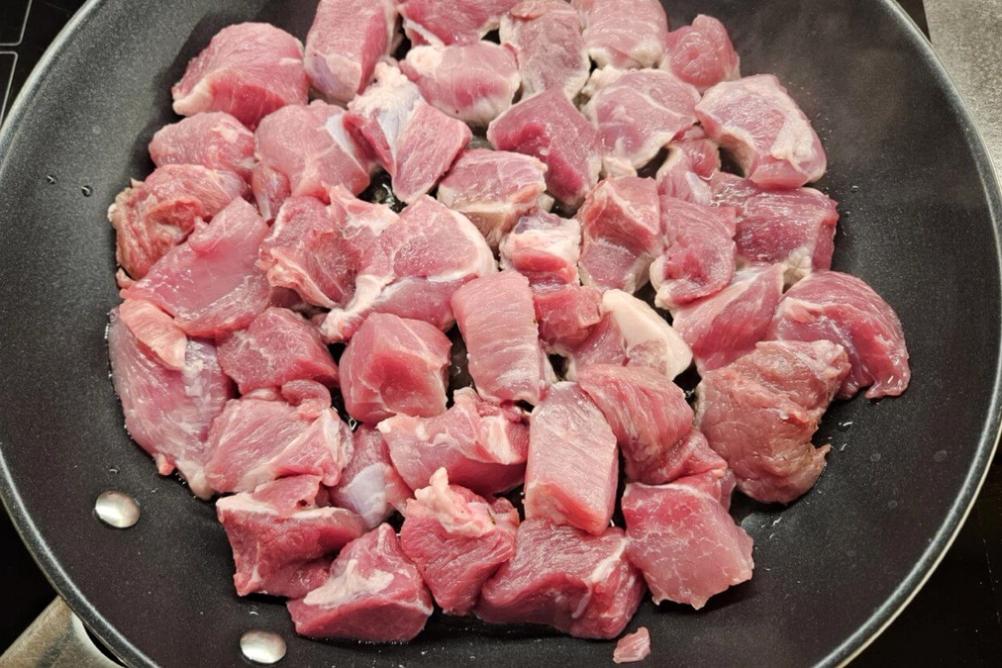 Cut the pork into 3 cm cubes. Heat a pan over medium heat, add oil, and sear the meat. Lightly season with salt and cook for 12-15 minutes, stirring occasionally, until a golden crust forms.