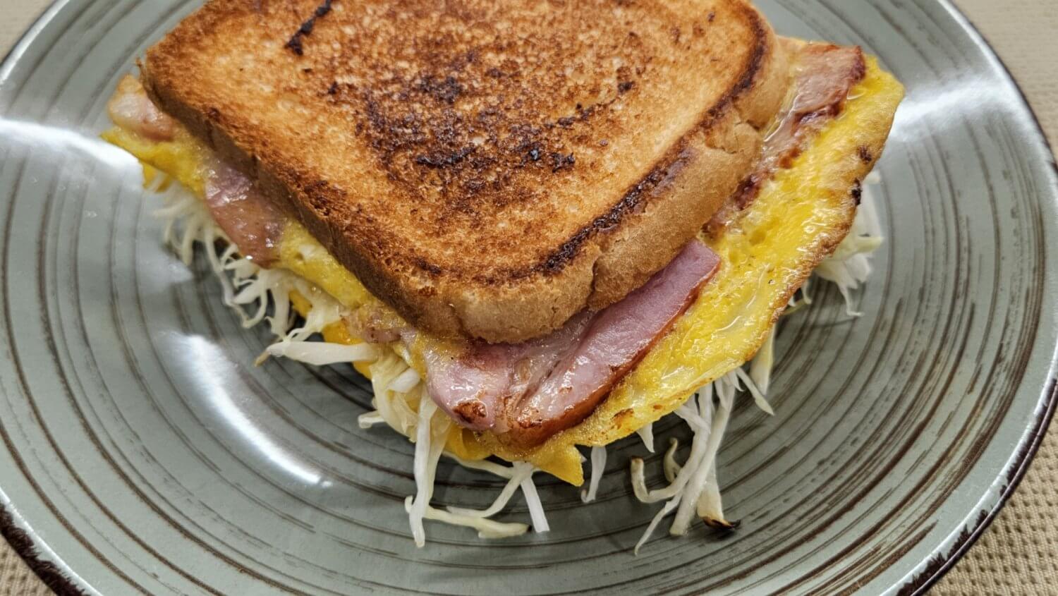 A hearty and flavorful sandwich layered with crispy ham, soft eggs, melted Cheddar cheese, and fresh crunchy cabbage. Perfect for a comforting breakfast or a quick snack, simple to make and absolutely delicious any time of day!