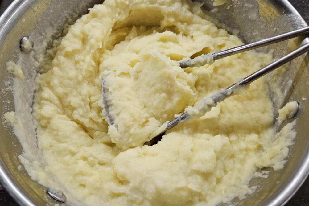 Pour the warm butter-and-cream mixture into the potatoes and mix until creamy and fluffy.