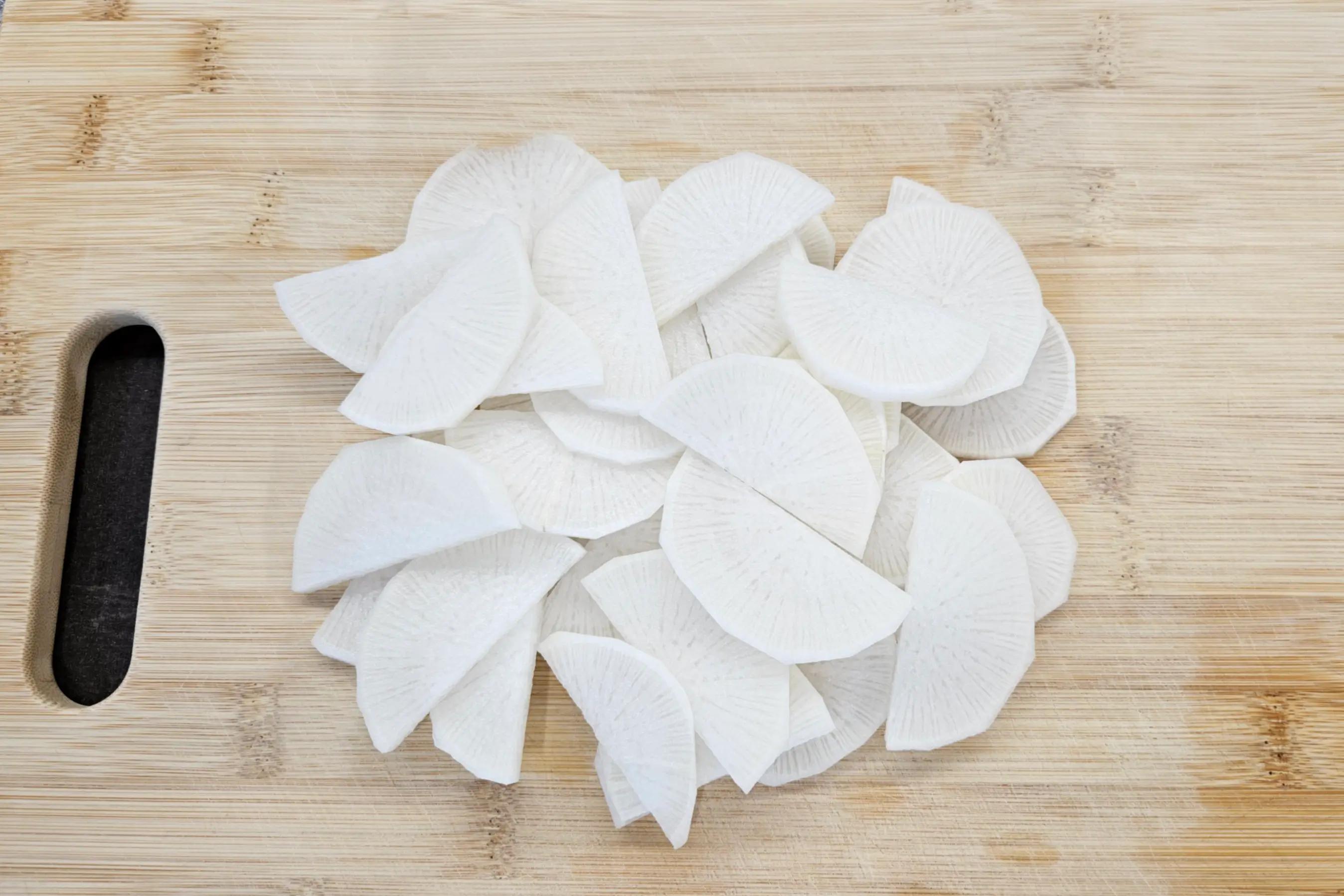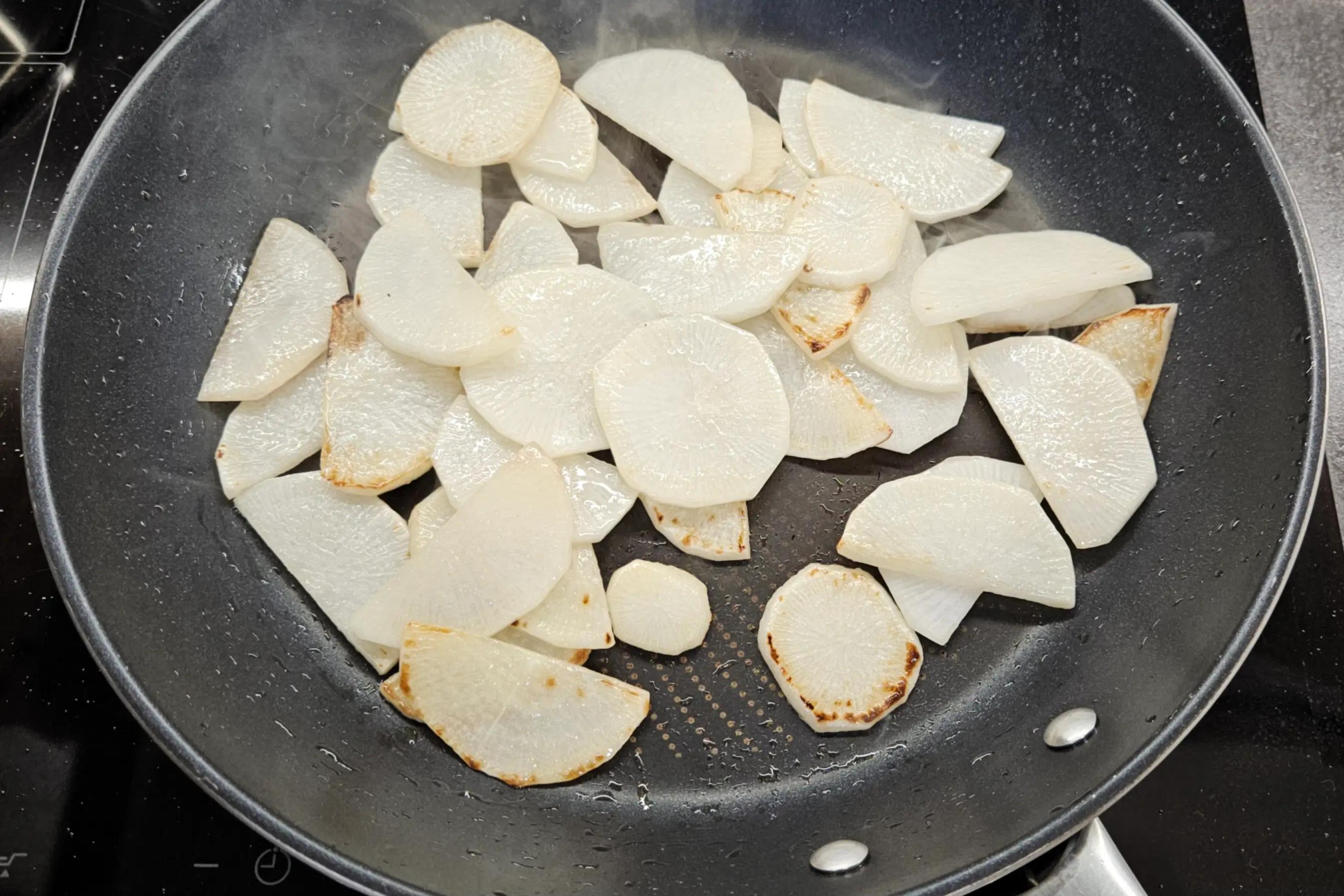 Thinly sliced pork and daikon are sautéed together, then simmered in a sweet-savory glaze made with mirin, soy sauce, and oyster sauce. The daikon turns tender with a slight bite, the sauce becomes glossy, and the whole dish comes together quickly. It’s simple, comforting, and great with a bowl of steamed rice.