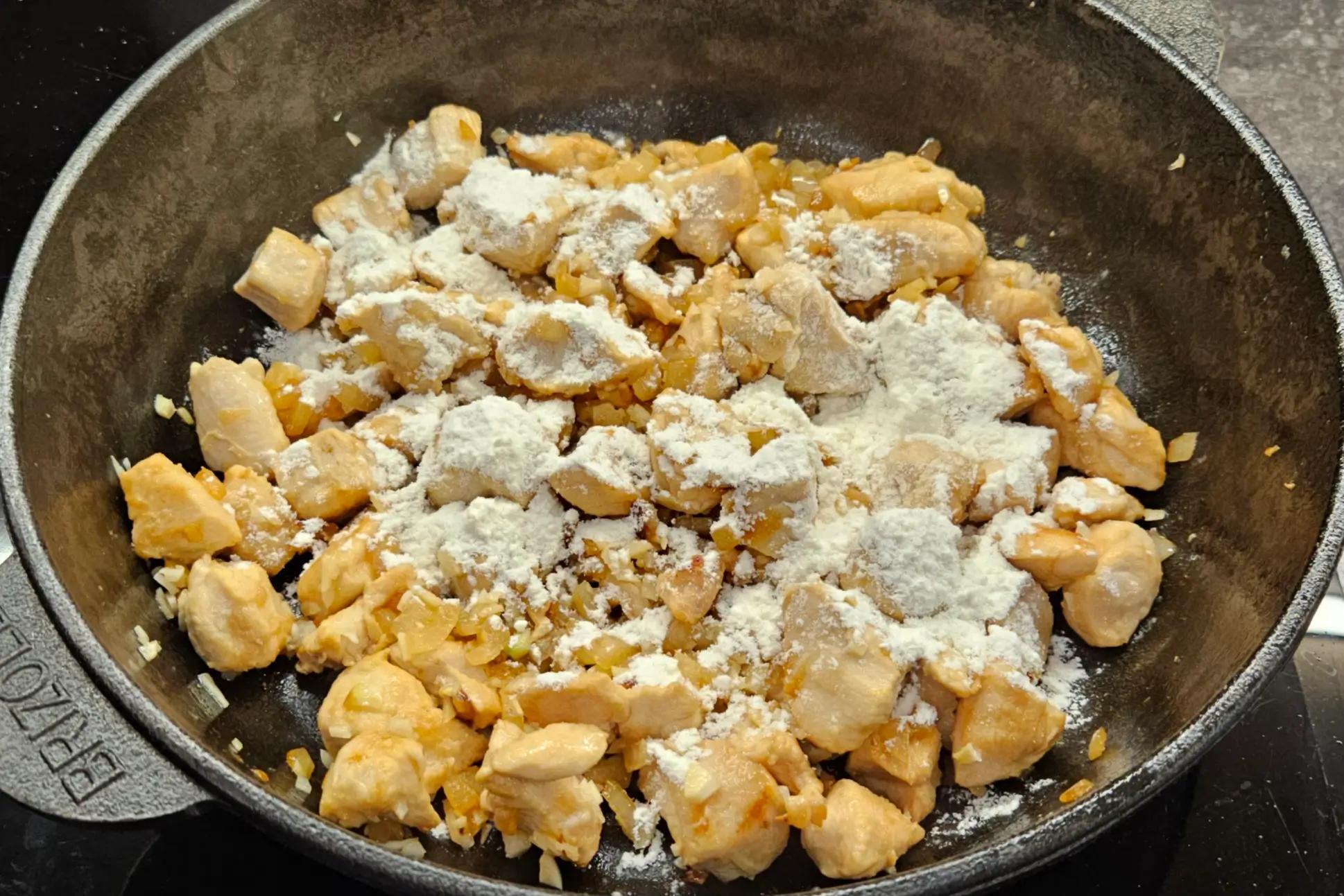 Додайте борошно й добре перемішайте, щоб воно рівномірно вкривало курку та цибулю. Готуйте 1–2 хвилини, постійно помішуючи.