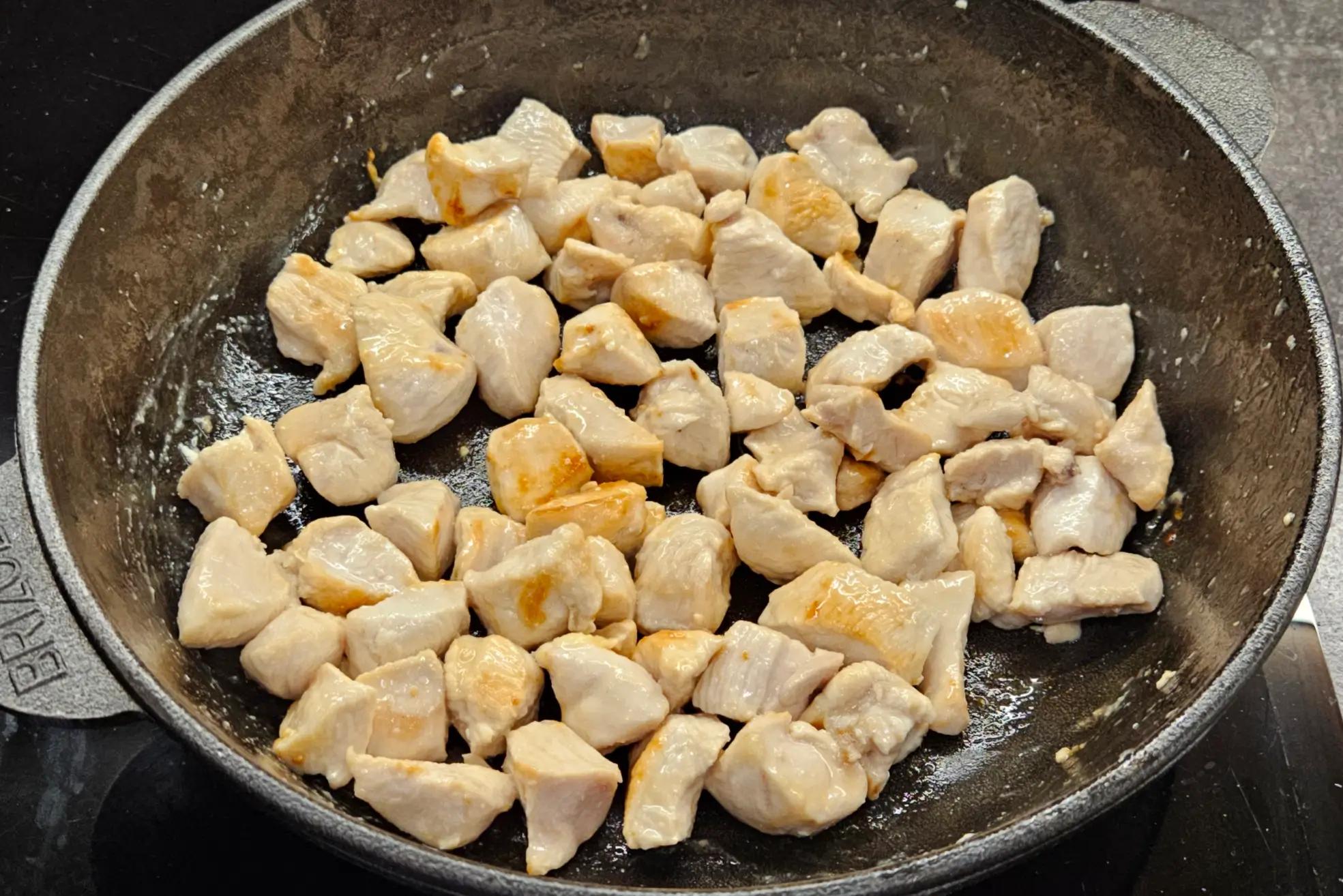 За 15 хвилин до готовності картоплі розігрійте сковороду на середньому вогні, додайте олію для смаження та обсмажуйте курку 5–7 хвилин, доки шматочки не стануть золотистими.