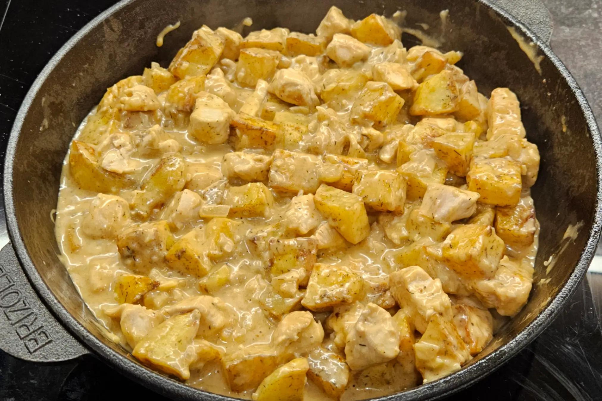 Соковиті шматочки курки в поєднанні з рум’яною запеченою картоплею та ніжним вершково-часниковим соусом створюють страву, яку хочеться готувати знову і знову. У рецепті немає складних технік чи дорогих продуктів — усе на основі простих інгредієнтів, які є майже в кожній кухні. Спочатку картопля запікається окремо, щоб отримати ідеальну золотисту скоринку, а потім поєднується з куркою та ароматним соусом, що загущується борошном і набуває ніжної кремової текстури завдяки вершкам. Завершує страву плавкий сир гауда, який утворює апетитну тягучу шапку в духовці. Це ситний, домашній рецепт, який чудово підійде для обіду чи вечері та легко адаптується під будь-які вподобання.