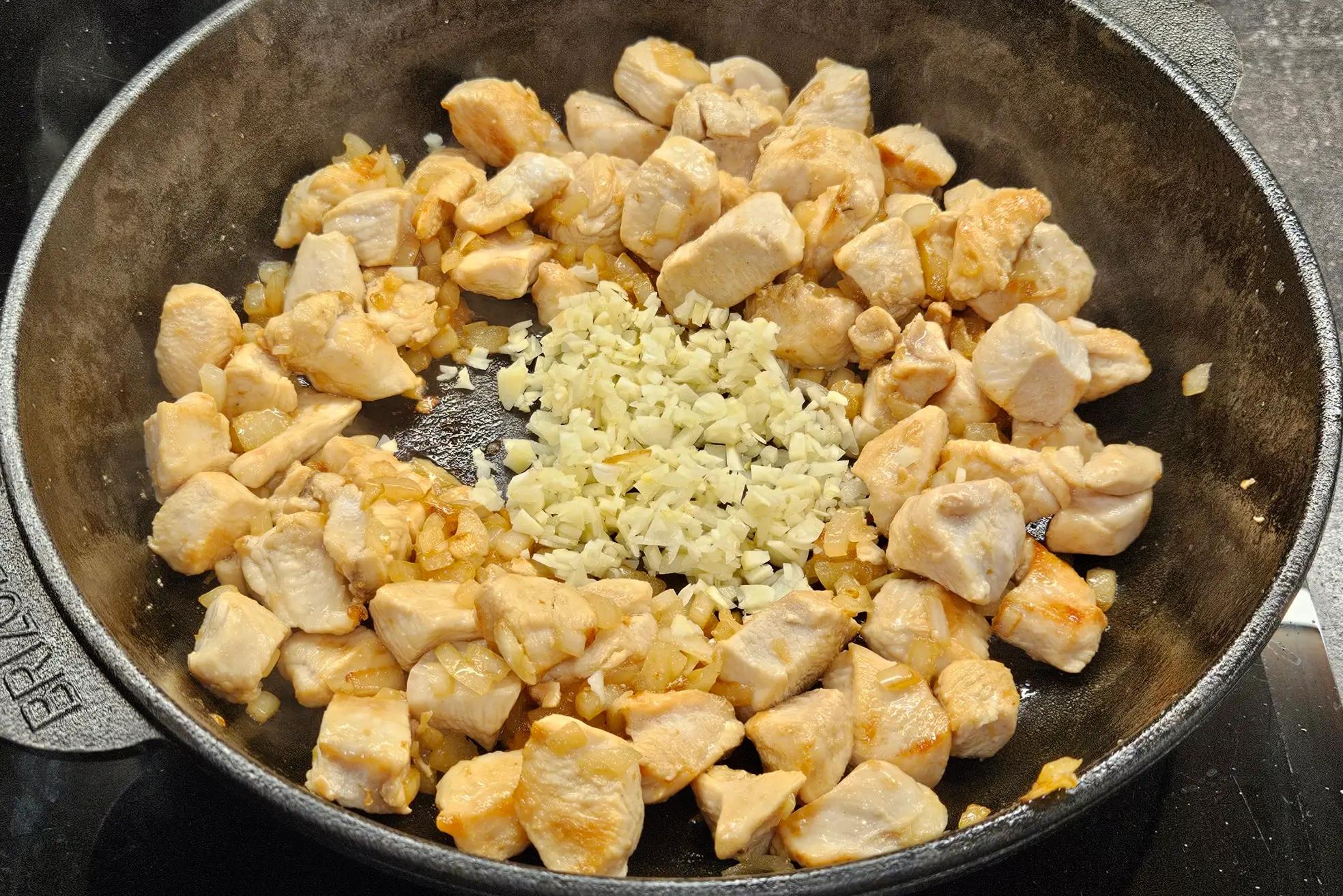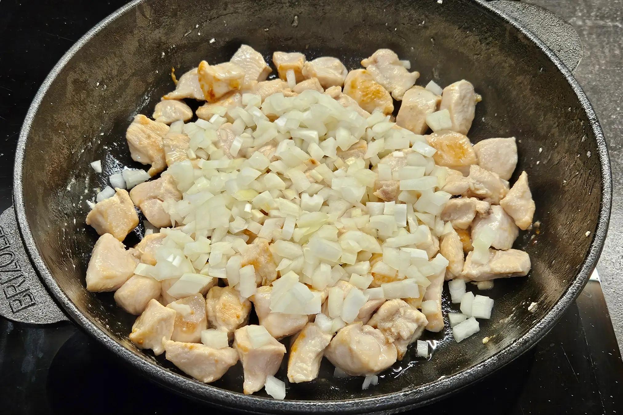 Додайте цибулю до курки та готуйте приблизно 5 хвилин, доки вона не стане м’якою.