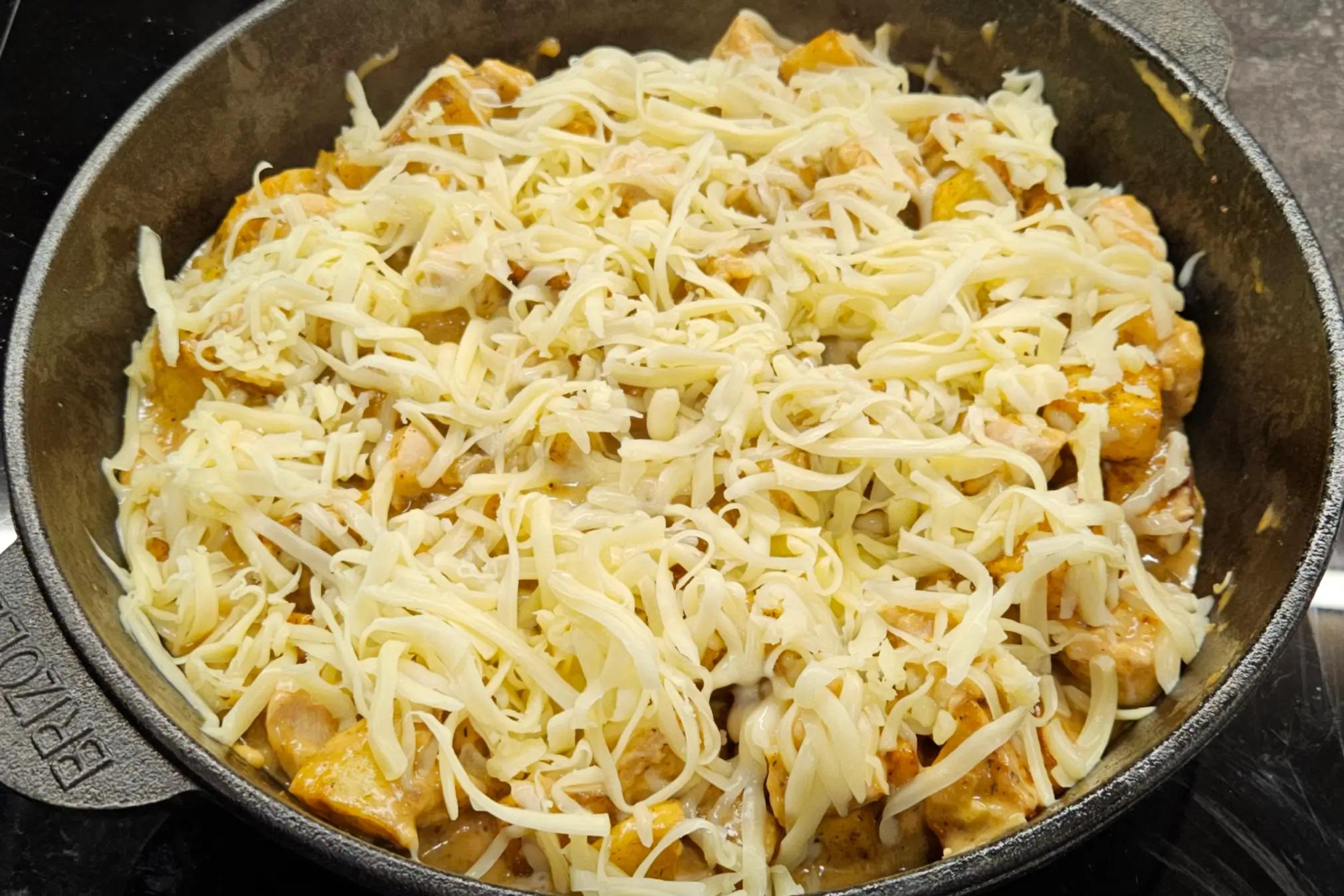 Зверху посипте страву натертим сиром гауда. Поставте сковороду в духовку й запікайте приблизно 10 хвилин, доки сир не розплавиться й злегка не зарум’яниться.