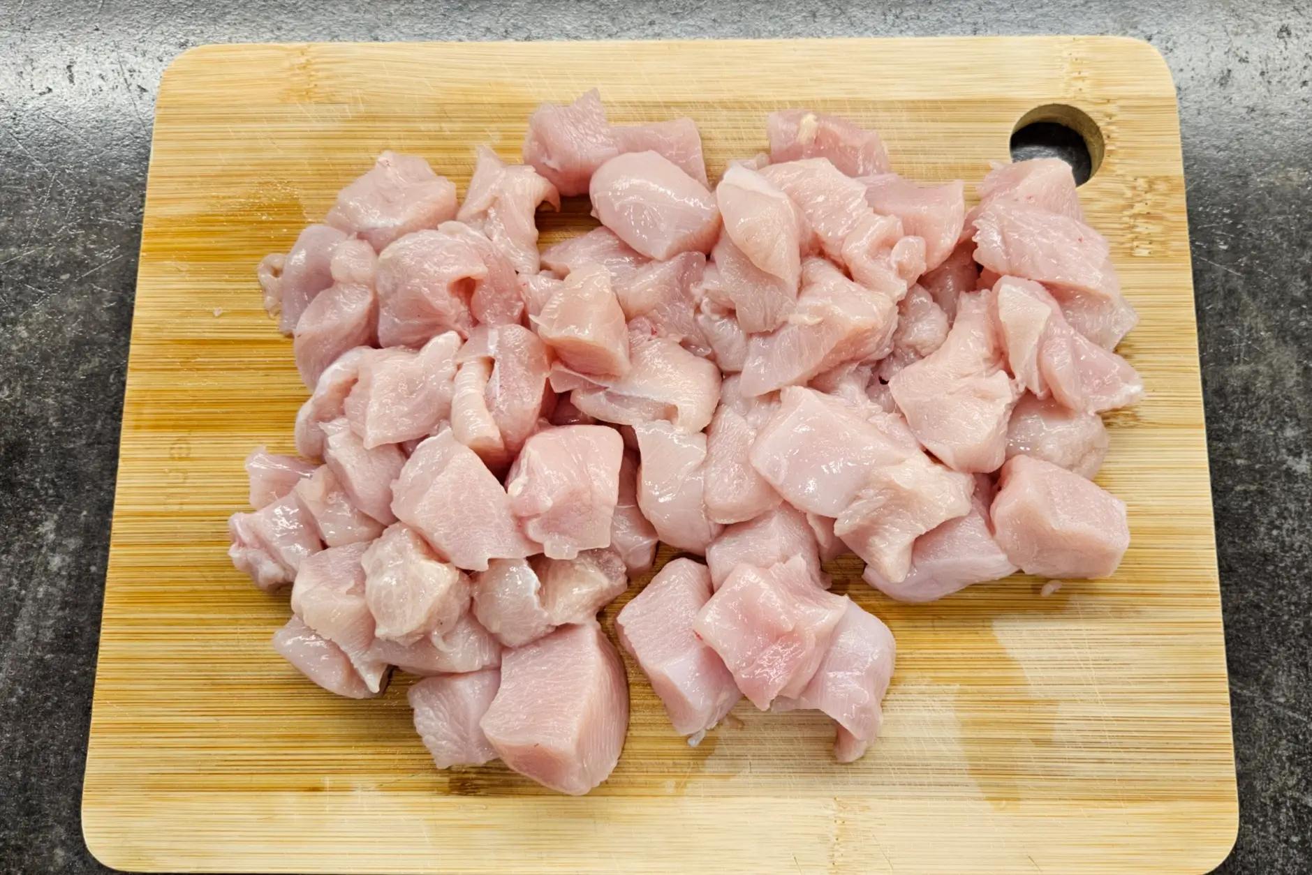 Тим часом наріжте куряче філе кубиками приблизно по 3 см.