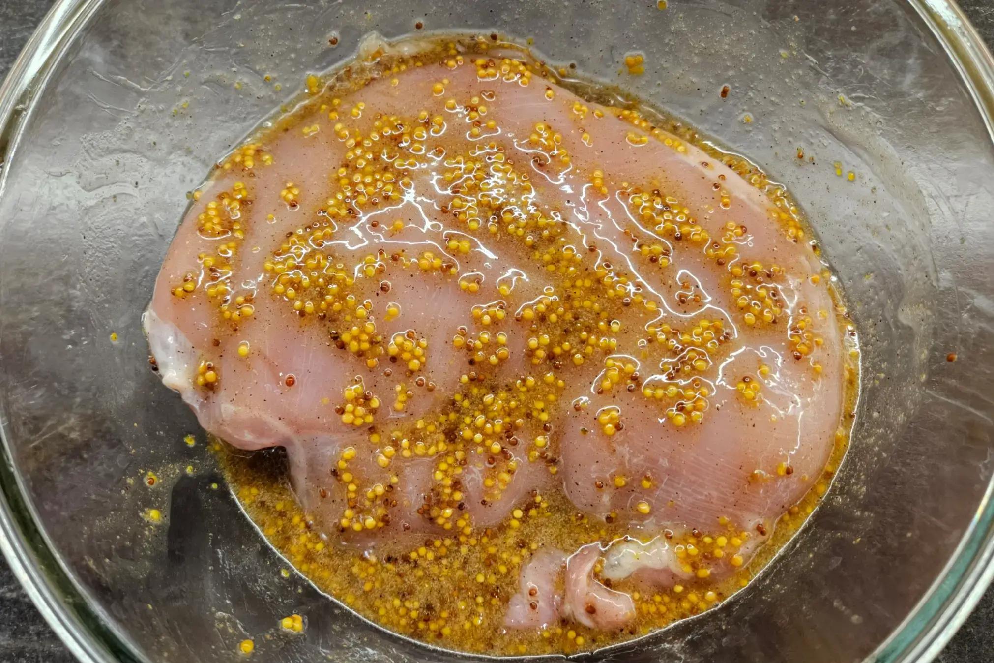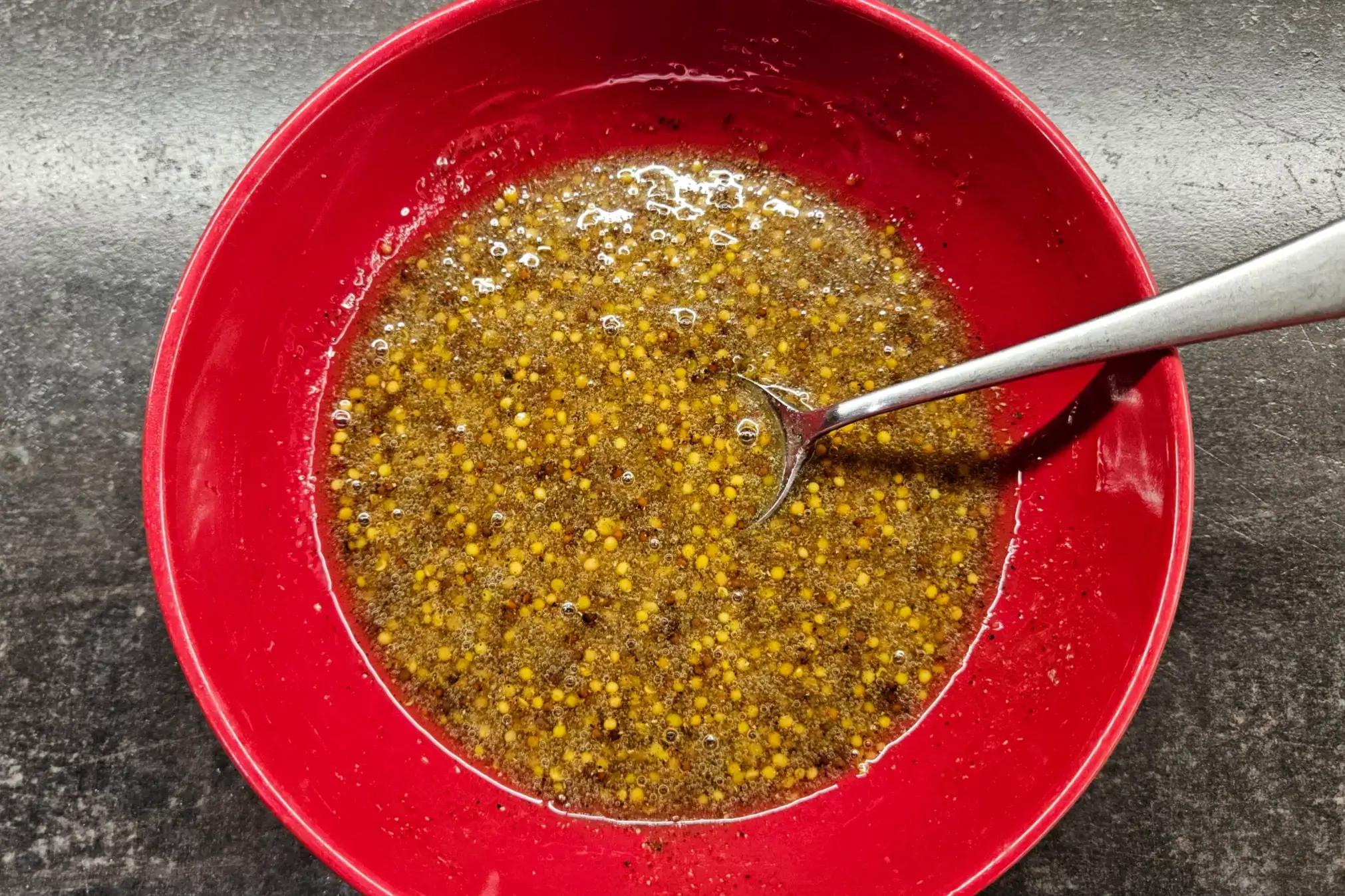 У глибокій мисці змішайте гірчицю в зернах, мед, соняшникову олію, сіль, мелений перець і коріандр. Добре перемішайте всі інгредієнти до однорідної консистенції, щоб утворився густий маринад.