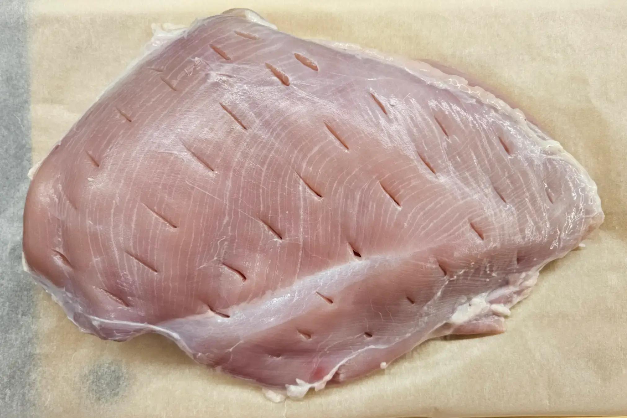 Ретельно промийте філе індички під холодною водою, щоб прибрати залишки вологи або можливі дрібні кісточки. Обсушіть м’ясо паперовим рушником. Зробіть кілька неглибоких проколів ножем з усіх боків, щоб м’ясо краще просочилося маринадом.